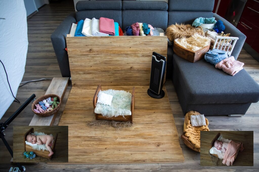 Zatímco maminka miminko kojí, připravím si místo na focení. Potřebuji pouze cca 2 metry. Nachystám si svoji podlahu, světlo, topení a všechny rekvizity k ruce. Jakmile je miminko nakojené, sám ho uspávám a maminka má tak chvilku pro sebe. Plně se věnuji jen miminku, polohuji ho a fotím ve všech připravených rekvizitách. Společné rodinné focení je většinou na konci, kdy potřebuji Vaše partnery a děti jen na chvilku, což většinou hlavně partneři velice ocení. Celé focení probíhá v klidu a citlivě, proto je také časově náročnější, cca 2-4 hodiny.